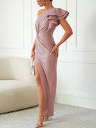 هذه الفستان الطويل يتميز بقصّة انسيابية مع كتف مكشوف. تضيف الدرجات المتراكبة والشق الجانبي لمسة من الرقي. مثالي للزفاف والسهرات والمناسبات الرسمية الأخرى.