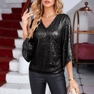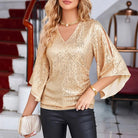 Denne bluse fremhæver silhuetten med sin raffinerede V-udskæring og sine flagrende ærmer, der falder smukt. De glitrende paljetter tilføjer et subtilt glamour til dit look. Ideel til aftener eller særlige lejligheder, den kombinerer sofistikeret stil og absolut komfort.