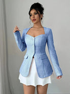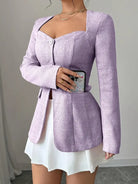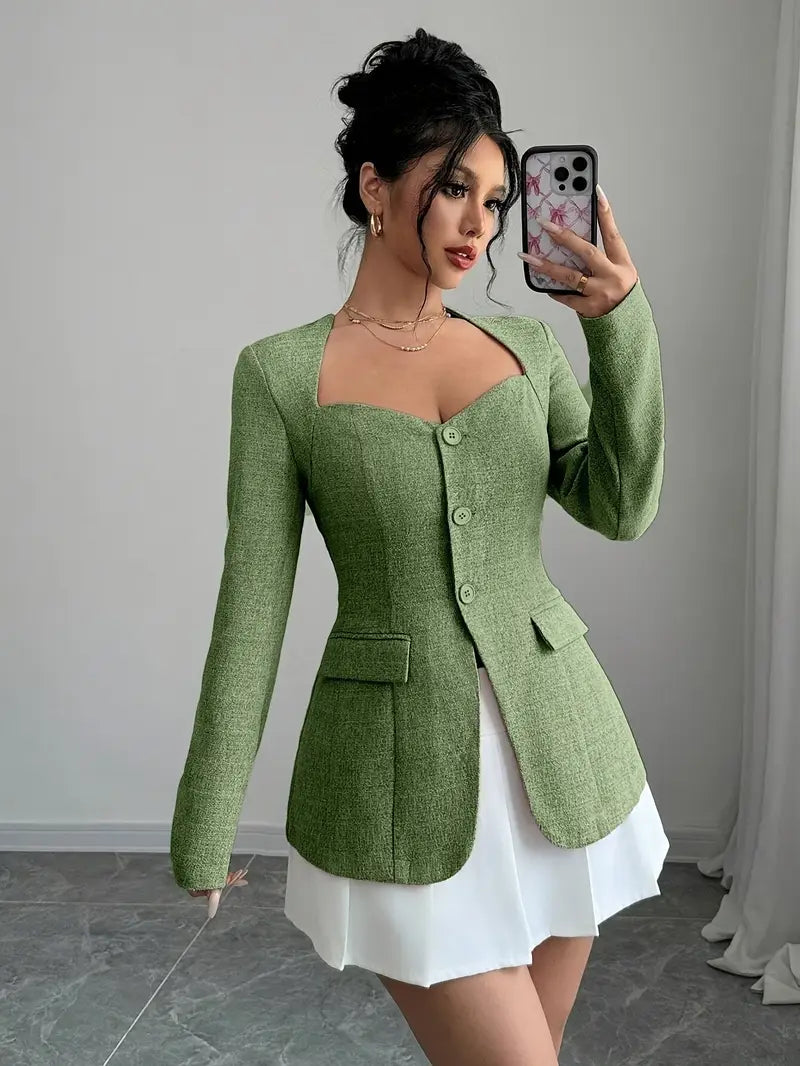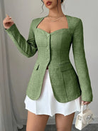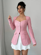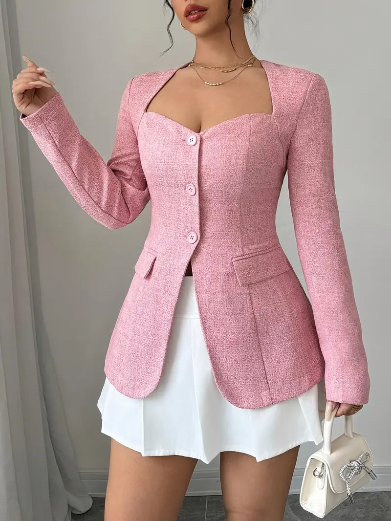 Diese knöpfbare Jacke betont die Silhouette mit ihrem taillierten Schnitt und dem modernen quadratischen Ausschnitt. Perfekt für einen eleganten und femininen Look, kann sie sowohl im Büro als auch beim Ausgehen getragen werden. Ihr sorgfältiges Design und die zarten Knöpfe verleihen Ihrem Outfit einen Hauch von zeitloser Raffinesse.
