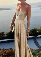 השמלה הארוכה הזו בגוון זהב אידיאלית לאירועים פורמליים. העיצוב המבריק שלה מדגיש את הסילואט שלכם. היא עשויה מחומרים איכותיים, ומבטיחה נוחות ועמידות.