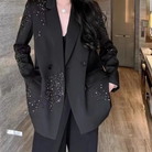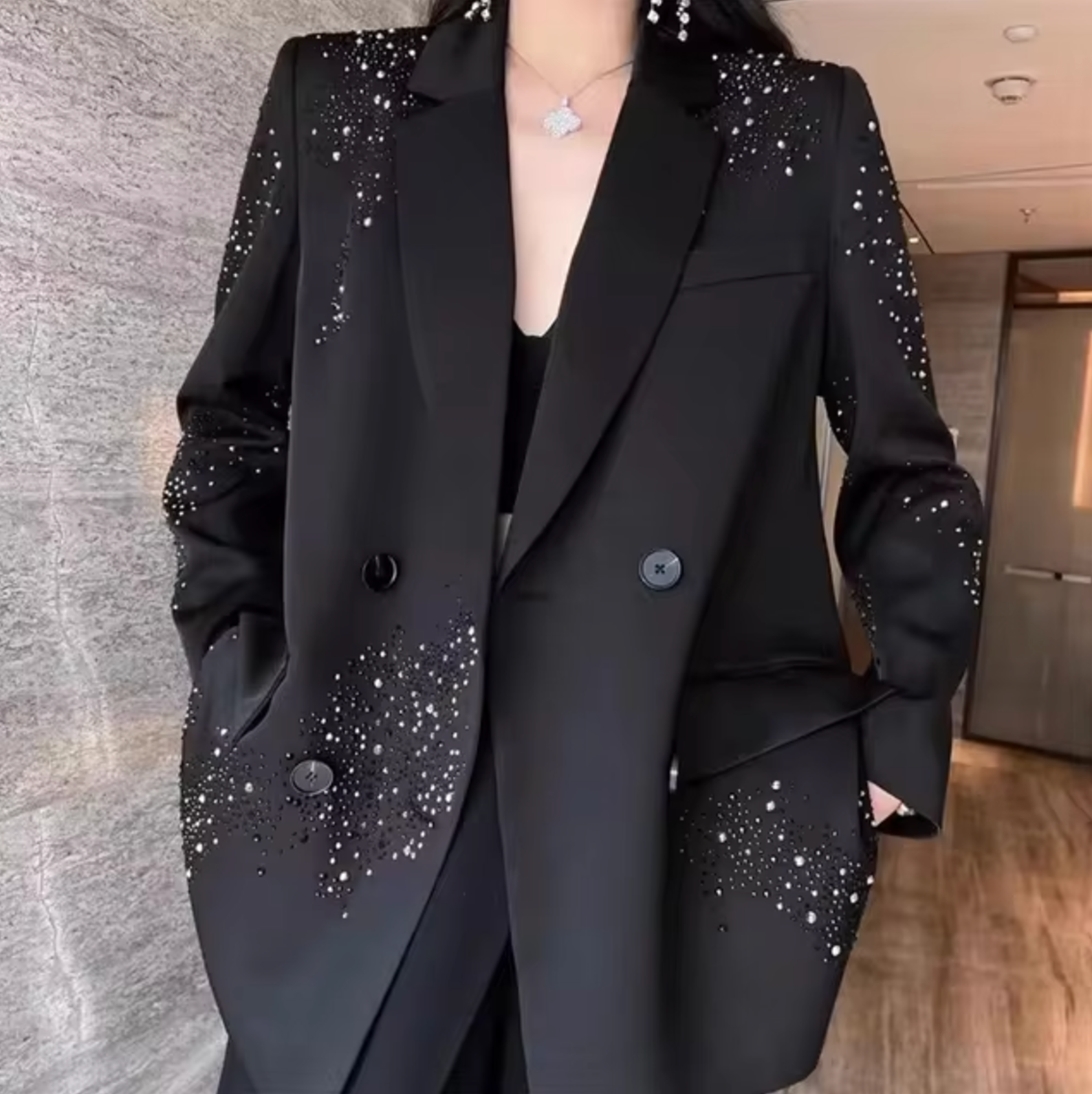 הז'קט השחור הזה מגלם את האלגנטיות המודרנית עם נגיעה של ברק עדין. הפרטים המנצנצים שלו מוסיפים נופך מעודן למראה שלכם, מבלי להיראות מוגזם. מושלם לערב אלגנטי או למראה מקצועי מהודר, הוא משלב בין צניעות לזוהר.
