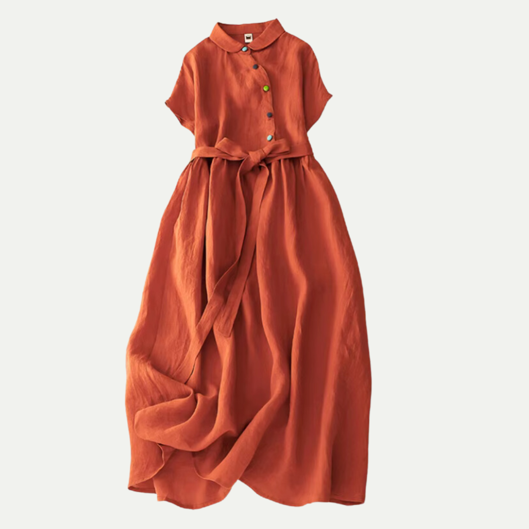 שמלה ארוכה זו מפתה עם הסילואט המחמיא שלה ועיצוב בהשראת הסגנון הוינטג'. נוחה ונושמת, ניתן ללבוש אותה בקלות בכל עונה. הכפתורים העדינים והגימורים הקפדניים מעניקים לה נופך של קסם נצחי, הראוי לרומן מתקופת זמן.