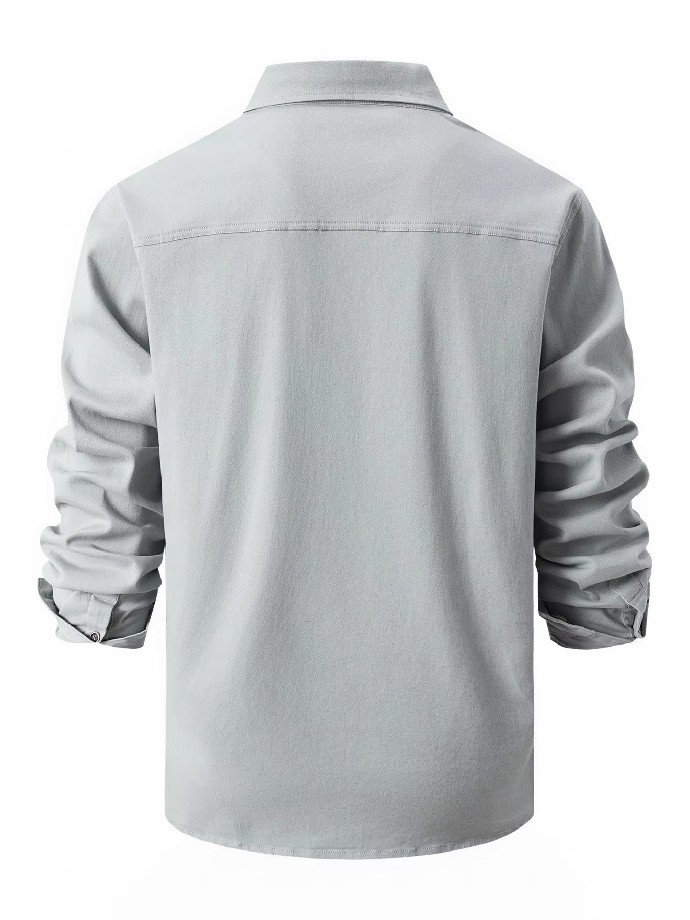 Ez a hosszú ujjú ing kontrasztos árnyalatú denim anyagból készült. Klasszikus, lehajtott gallérral és középső gombolással rendelkezik, amely strukturált és laza stílust kölcsönöz. A mellkasi zsebek funkcionális dimenziót adnak hozzá. Tiszta szabása különböző alkalmakra alkalmas, a mindennapoktól a elegánsabb rendezvényekig.
