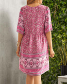 このボヘミアンドレスは、魅力的なVネックとエレガントなプリントが特徴です。流れるようなシルエットは、1日中快適さを保証します。カジュアルな機会や夏の外出に最適です。