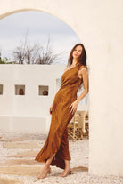 このロングイブニングドレスは、片方のストラップの大胆なカットと繊細なプリーツ生地で魅了します。フィット感のあるウエストがエレガントにシルエットを引き立て、一方で流れるような仕上げが洗練された印象を与えます。正式なイベントや特別な夜のために輝くのに最適です。