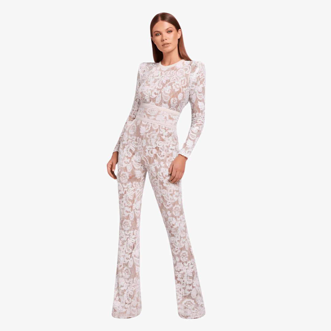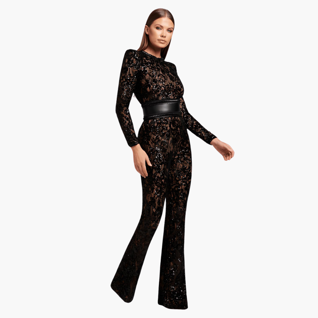 - 長袖とフレアパンツのエレガントなデザイン。