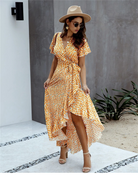 このエレガントなロングドレスは、田舎の結婚式や屋外のパーティーに最適です。フレアシルエット、Vネック、細いベルトが優雅にシルエットを引き立てます。花柄と黄色の色合いが春らしく明るい印象を与えます。