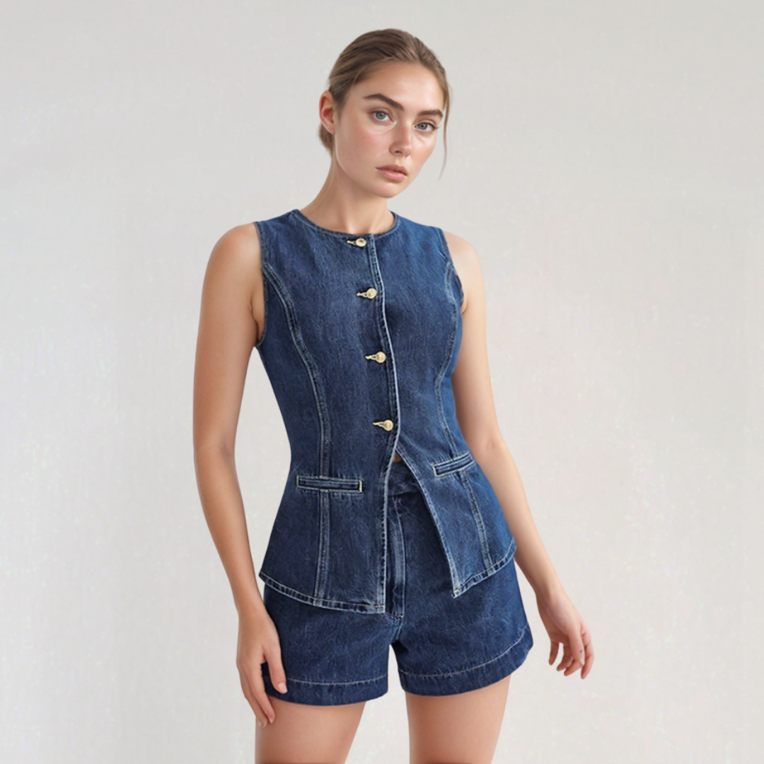 このセットには、金色のボタンと前面ポケット付きの構造的なノースリーブジャケットが含まれています。ハイウエストのショートパンツは、魅力的なシルエットと最適な快適さを提供します。