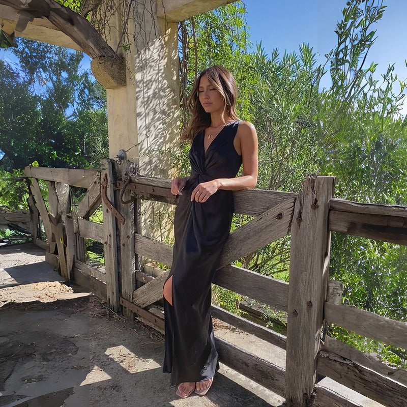 このスリットドレスは、エレガントなスリットと流れるようなカットでシルエットを引き立てます。特別な場面のためにデザインされており、洗練されたスタイルと動きの自由を兼ね備えています。その時代を超えたデザインは、あらゆる状況でシックな印象を保証します。