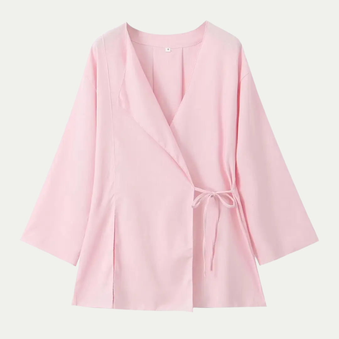 このセットは、ゆったりとした袖の着物スタイルのシャツと、ワイドレッグのハイウエストパンツを組み合わせて、流れるような洗練された印象を与えます。軽くて快適で、暑い日には最適です。複数のカラーで利用可能で、夏のスタイルと動きの自由を兼ね備えています。