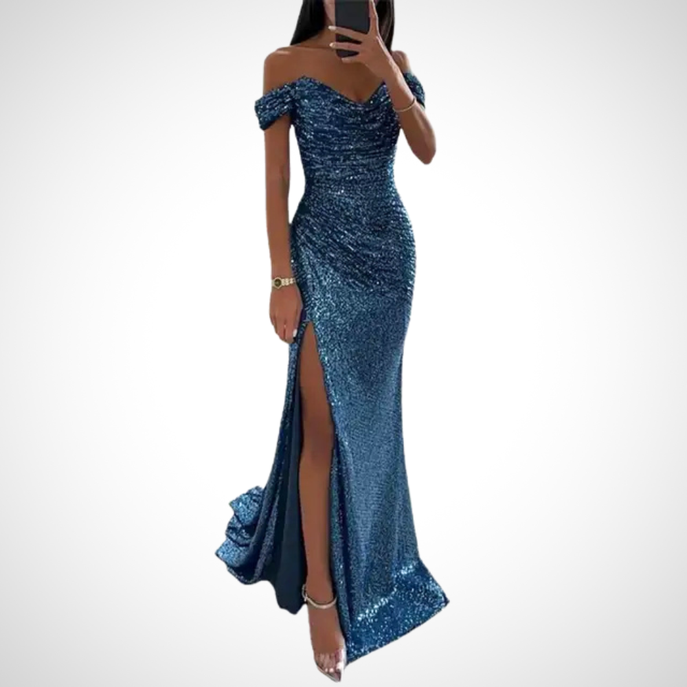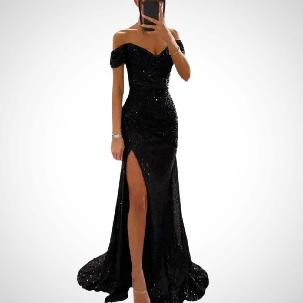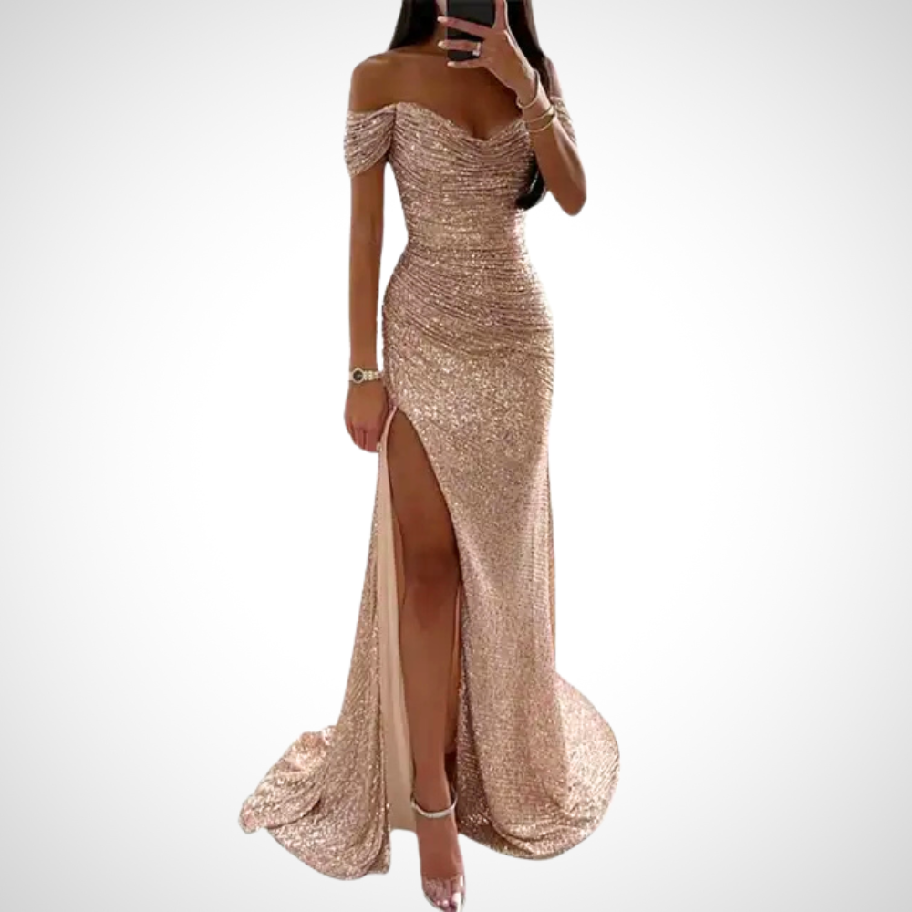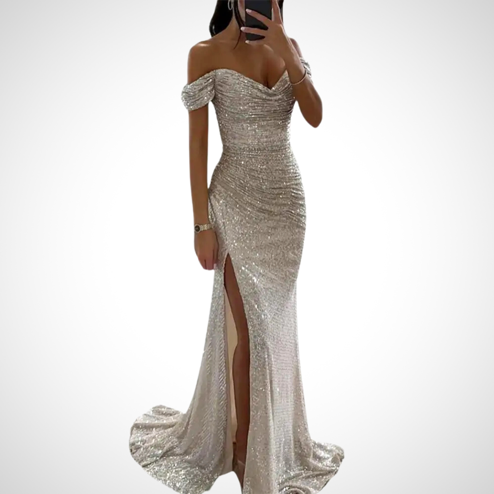 Denne lange, stroppeløse kjolen gir en flytende og elegant silhuett. Dens enkle design fremhever skuldrene og utringningen. Perfekt for spesielle anledninger, den kombinerer komfort og stil.