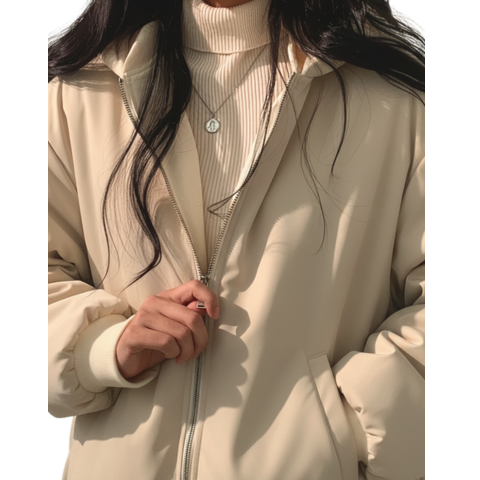 Dit jack valt op door zijn omkeerbare ontwerp, met een lichtgrijze kant die een glad visueel effect heeft en een ivoorkleurige kant die er volumineuzer uitziet. Elke kant biedt een andere uitstraling: de één voor een sobere stijl, de ander voor een meer omhulde en textuurrijke look. De korte snit, de geïntegreerde capuchon en het genereuze volume maken het een ideaal stuk voor frisse dagen waarop je je outfit wilt variëren zonder van kleding te veranderen.